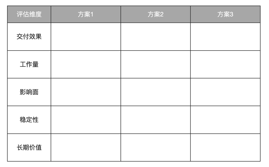 - 长期价值:该方案是不是长期方案?有时候对方案做长期投资也是很重要的一件事,短视的方案虽然工作量会减少一些,但会阻碍未来新项目迭代,欠的技术债可能要加倍还上。